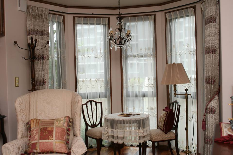5連の窓のそれぞれの枠内に、レースをつけ、