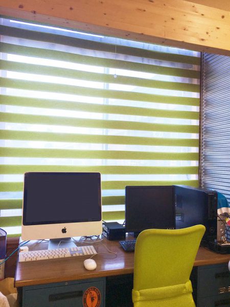 今まで調光機能は、横型ブラインドが主流でしたが、ファブリック製品のやわらかさと調光機能を兼ね備えた “調光型ロールスクリーン” をお納めさせていただきました。