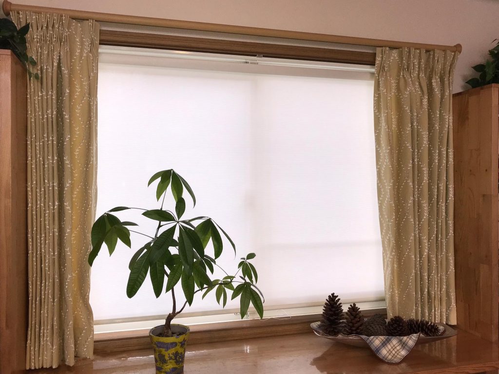 カーテンと木枠内にロールスクリーン。