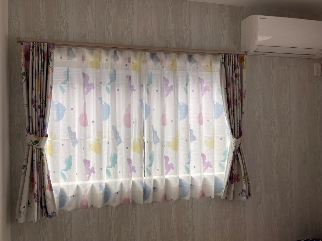 次は縦ストライプの効いたグレーの遮光カーテンを選んでいただいた寝室です。